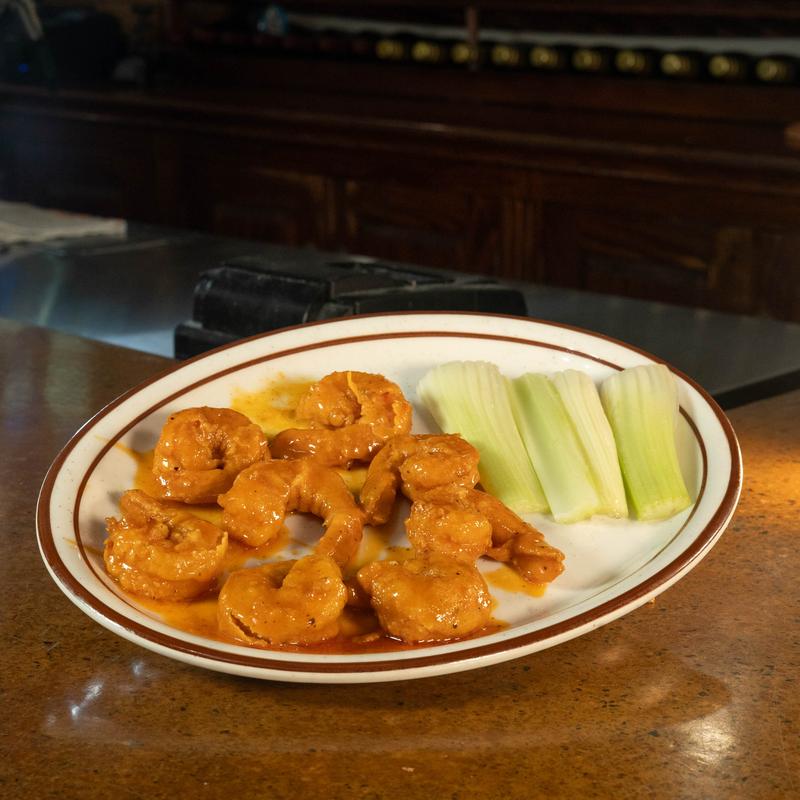 Hand-breaded jumbo shrimp fried lightly and dipped in buffalo sauce. Served with blue cheese dressing and celery sticks.